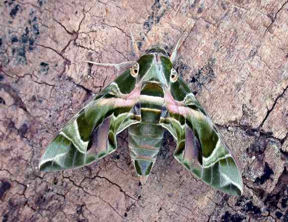 The Oleander Hawkmoth is a large and magnificent moth that usually lives in hot countries in Africa and Asia. It has very big wings that are wider than a small egg box. The wings have beautiful curved patterns that look like art, with colors of green, brown, cream, and purple mixed together.