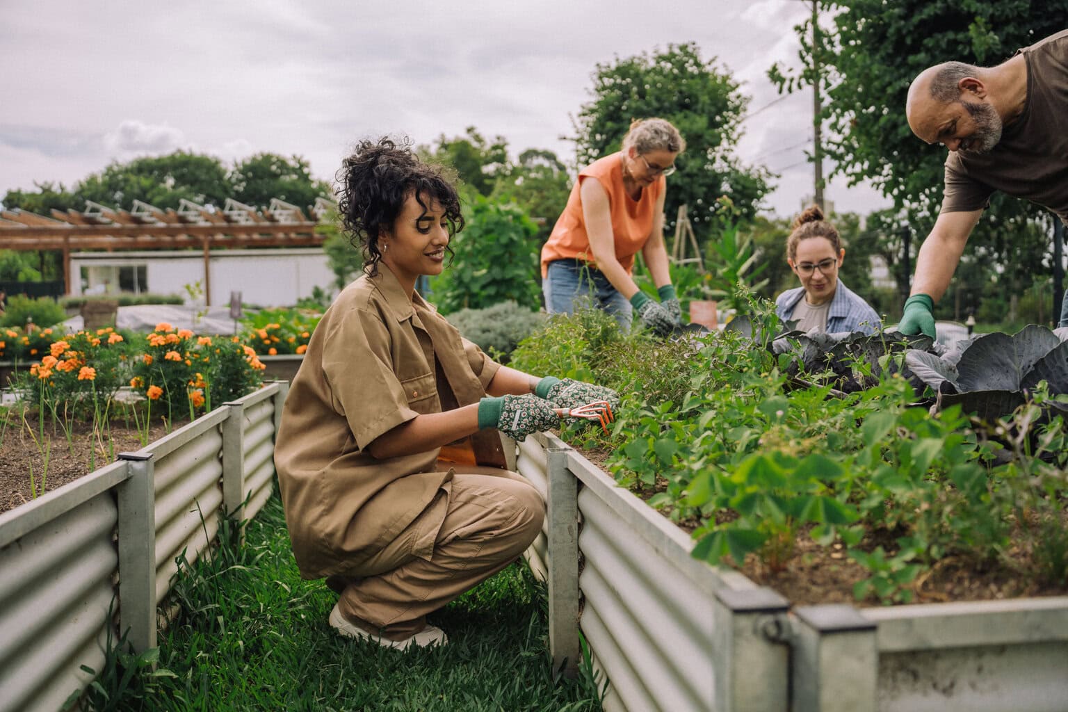 Group of friends taking care of community garden