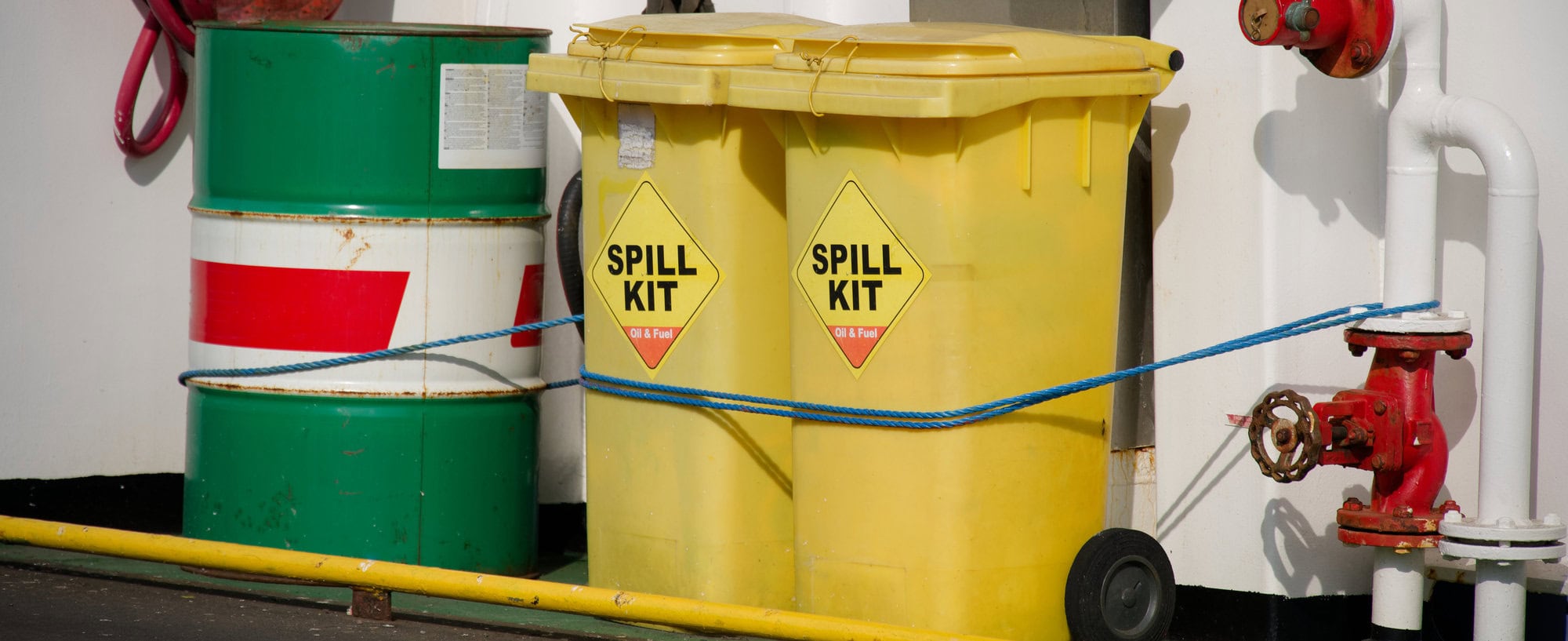 Spill kit yellow wheelie bin for health and safety of chemical, oil, diesel or petrol pollution leak