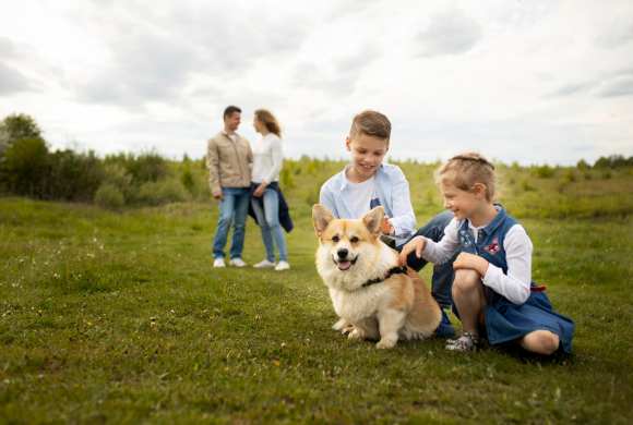 ALT: two kids sitting with dog outdoors with parents behind them